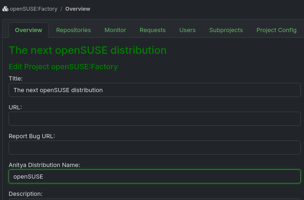 You need to be the project maintainer for every project in which you want to set this feature up. Open up the project and click the edit button. Modify the Anitya Distribution Name value to one of the distributions listed in the Release Monitoring Distribution List. Follow Section 13.1.2, “Which Distribution Is Right for Me” if you are unsure which distribution to choose. If the appropriate Distribution doesn't exist, create it.