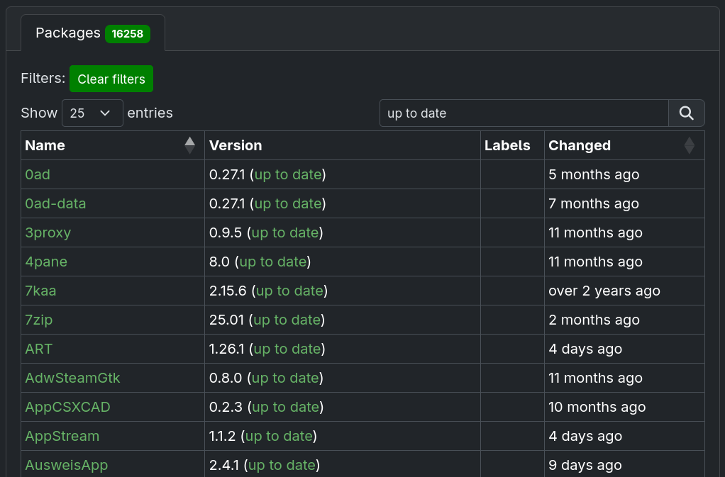 In some cases, you may want to get an overview of the packages that are in a specific version state. In such cases, searching by the strings visible in the Version column (i.e. no upstream or up to date) is possible.